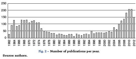 The first articles identified were published in 1963 (n = 84). As of that date, we observed a trend towards an increase in the number of publications per year until 1975 (n = 62). Afterwards there was a steady decline in the number of publications down to a minimum in 1988 (n = 7). No important changes were observed in the number of publications until 2004, when the numbers picked up and reached a peak finally in 2010 (n = 174) (Fig. 2).