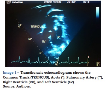 The truncus arteriosus is characterized by the presence of a single arterial vessel emerging from the base of the heart and irrigates the coronary bed, the pulmonary circulation, the systemic circulation, and usually presents interventricular communication. From the embryological perspective this defect is the result of a failed division of the common truncus between the pulmonary artery and the aorta. A deletion of the 22q11 chromosome has been identified in up to 35% of the patients.7