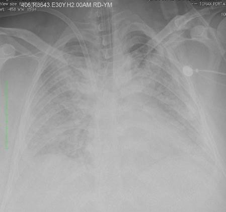 All patients had severe ARDS, according to the Berlin ARDS definition3, and were cannulated for VV ECMO if they had a persistent partial pressure of oxygen/ fraction of inspired oxygen (PaFi) < 100 with a fraction of inspired oxygen > 90% despite optimal medical treatment for 6 hours or less. Patients from other institutions were transferred using air or ground transportation. Figure 1 shows a chest X-Ray in a patient with ARDS.