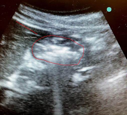 The treating anesthesiologists performed the gastric US in the supine and right lateral decubitus positions. The result showed a full stomach with images suggestive of solid and liquid food content (Figure 1).