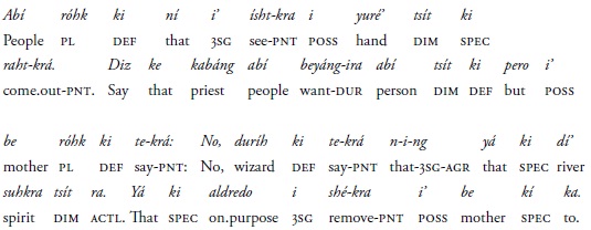 Syndetic complement clauses are also objects of complement-taking verbs and they are introduced by the connective ní (ni) (17). Towards the end of the existence of the language there was a rather widespread use of the Spanish connective ke ('that') in substitution of the Boruca form ní; see (18) below.