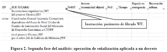 Por último, otro modo de apreciar la operación de señalización de categorías focales (que, como se explicó, es previa a la operación de triangulación de datos) es la aplicación de filtros. Este procedimiento se puede efectuar sobre cualquier discurso analizado por este método y sobre cualquier categoría discursiva presente en el análisis. Consiste en aplicar WF como parámetro de búsqueda para realizar el filtrado de categorías focales, lo cual permite agrupar dichas categorías y visualizarlas conjuntamente en la diacronía del discurso. El fragmento del análisis expuesto en la Figura 2 ilustra esta posibilidad. En este caso, puesto que, tal como se indicó en la Tabla 4, la categoría H–P (GCABA) es la categoría focal predominante, se aplicó el filtro sobre ella.
