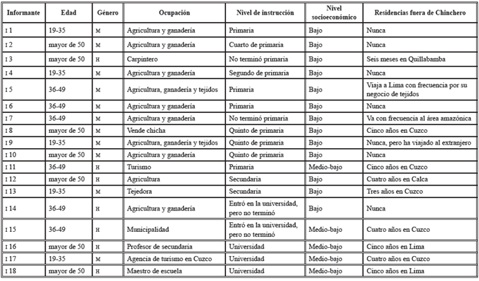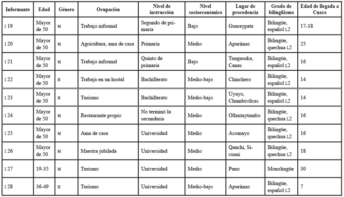 La ciudad de Cuzco, en cambio, cuenta con una población de 108 798 habitantes, es receptora de movimientos migratorios dentro del área andina del sur de Perú y se distingue por la gran heterogeneidad cultural y lingüística de su población. Los informantes entrevistados para el presente estudio son migrantes que proceden de localidades del departamento de Cuzco y que se mudaron a la ciudad en su juventud en búsqueda de mejores oportunidades de estudio o de trabajo. Cinco son bilingües con quechua como l1, cuatro son bilingües con español como L1 y una es monolingüe en español. En ambas muestras, se entrevistó a personas con diferentes características, las cuales se pueden apreciar en las Tablas 1 y 2.