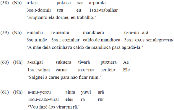 Essas conjunções formaram-se em Nheengatú a partir da gramaticalização de formas nominais da língua: «pukusa» é formado pela forma nominalizada do verbo intransitivo estativo «puku» 'ser comprido', ao passo que «arã» desenvolveu-se como subordinador de finalidade a partir da gramaticalização da forma «arama», registrada por Anchieta (1990 [1595]) como uma marca de 'futuro dos nomes'18. Em termos morfossintáticos, observa-se que os predicados não apresentam nenhuma alteração morfológica, assim tanto o verbo da oração principal quanto o verbo da oração subordinada flexionam-se com o paradigma da série i, no caso de verbos ativos, como ilustrado nos exemplos 58 e 59. Nos exemplos 60 e 61, apresentam-se orações subordinadas com núcleo verbal intransitivo não ativo e não flexionável, e com núcleo nominal, respectivamente.