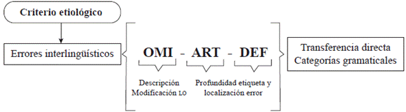La estructura de la etiqueta permite identificar el error de acuerdo con la descripción de la modificación de la LO, en este caso omisión (OMI) de la categoría gramatical, seguido de la localización y profundidad de la categoría gramatical en el artículo definido (ART-DEF). De esta forma, la etiqueta refleja que el error está localizado en las categorías gramaticales en un nivel de profundidad de análisis por palabra.
