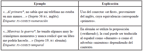 A continuación, se pueden revisar algunos ejemplos en el uso erróneo de los conectores en español como LE (Tabla 19).