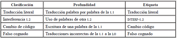 En la taxonomía que se propone (Tabla 20) se considera etiquetar los errores correspondientes a las siguientes problemáticas generadas por influencia de la LI: