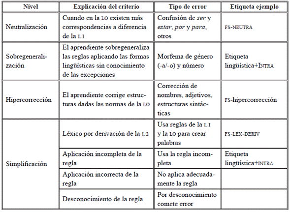 Considerando la presentación de la composición de las etiquetas y posibles procedimientos metodológicos para su uso, a continuación, se explica la taxonomía propuesta acorde con la identificación de errores producidos por la transferencia (interlingüísticos) y los errores referidos a los niveles de desarrollo que tiene la interlengua (intralingüísticos).
