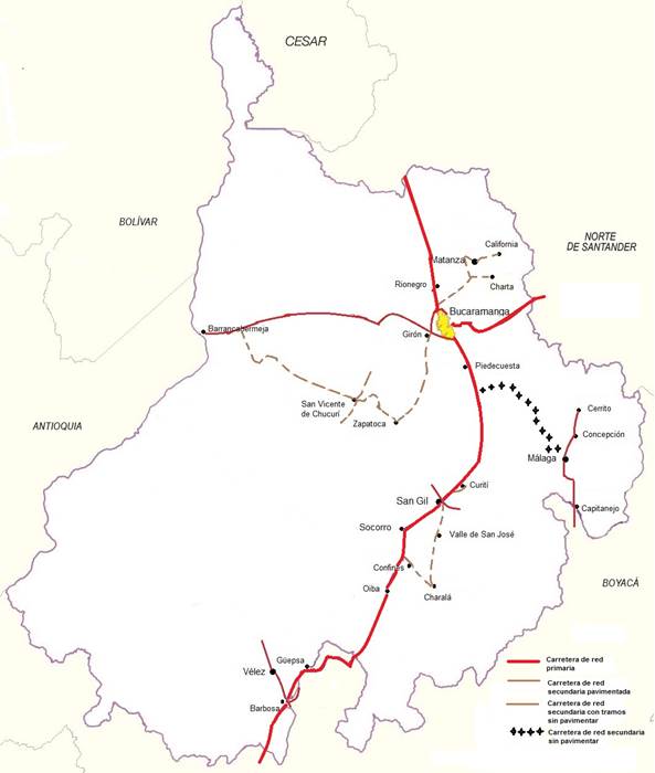 La red secundaria es el sistema que comunica las capitales de provincia con localidades bajo su jurisdicción en las provincias rurales; por ejemplo, San Gil-Valle de San José, San Gil-Charalá; Matanza-Charta, Matanza-California; Málaga-Cerrito, entre otros. Estas vías tienen una alta movilidad, en gran parte por el papel administrativo de la capital de provincia y su indiscutible influencia sobre los municipios a su cargo: administrativa-política, jurídica, educativa, cultural y económica. El acceso desde los municipios hasta sus veredas se hace a través de vías terciarias. Este puede ser bastante irregular y tardío. Las vías suelen ser pavimentadas solo en algunos fragmentos cortos. En su mayoría, constituyen placas huellas para el afianzamiento de las ruedas de vehículos, muchos de los cuales ya han salido de circulación como medios usados otrora para el transporte público municipal.