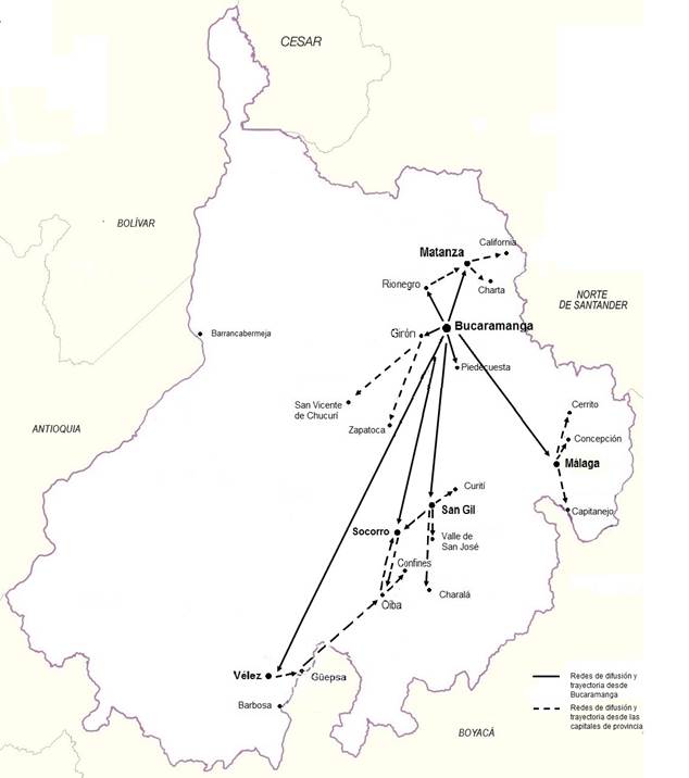 En el contexto de Santander rural, el proceso de difusión se llevaría a cabo de manera organizada y con jerarquía escalonada. Así, los patrones se difunden desde Bucaramanga hasta las capitales de provincia y desde estas a los municipios de menor población hasta sus veredas (y zonas de influencia aledañas). Si asumimos que la transmisión se da entre centros inferiores, propondríamos una estructura vertical. Un caso particular es la red de difusión desde Málaga en la Provincia de García Rovira, en el externo oriental, hasta sus centros de influencia: Cerrito, Concepción y Capitanejo.