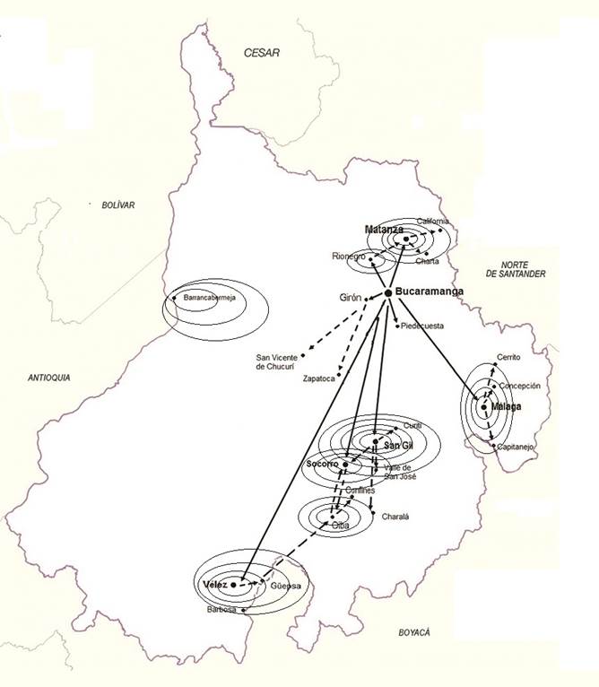 La capital de provincia constituye el centro administrativo, de infraestructura y desarrollo de las comunidades bajo su competencia, alrededor de la cual se dinamizan los procesos políticos, económicos y sociales. Es el foco urbano que mantiene el sentido histórico-cultural del poblamiento de la provincia (Gobernación de Santander & USTA, 2014, en referencia a lineamientos y directrices para el ordenamiento territorial del departamento). Como consecuencia de la centralización administrativa y regionalización de la provincia, el estudio establece que existe un alto nivel de asociación y dependencia por parte de los municipios de la región con las capitales de provincia (y de algunos centros urbanos menores con influencia a nivel local, como es el caso de los centros de cruce de patrones propuestos más abajo).