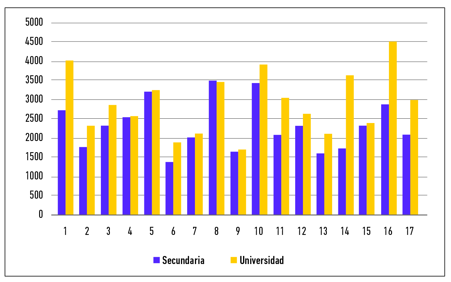 Respecto a los alumnos de Secundaria, los números de palabras sí cambian mucho, desde 3 409 palabras (8.64%), que contiene el centro más productivo (08 La escuela: muebles y materiales), seguido muy de cerca por 01 Partes del cuerpo, con 4 001 palabras (8.11%), y por 10 La ciudad, con 3 909 palabras (7.92%). En cuanto a los centros de interés que cuentan con un menor número de palabras, cabe mencionar 06 Objetos colocados en la mesa para la comida, con 1 366 palabras (3.46%); en segundo lugar, 13 Trabajos del campo y del jardín, con un total de 1 589 palabras (4.03%), y, en tercer lugar, 09 Iluminación, calefacción y medios de airear un recinto, con 1 640 (4.16%). Esto podría indicar que los estudiantes de universidad tienen mayor cantidad de palabras en su repertorio léxico en la mayoría de los ámbitos temáticos cotejados.
