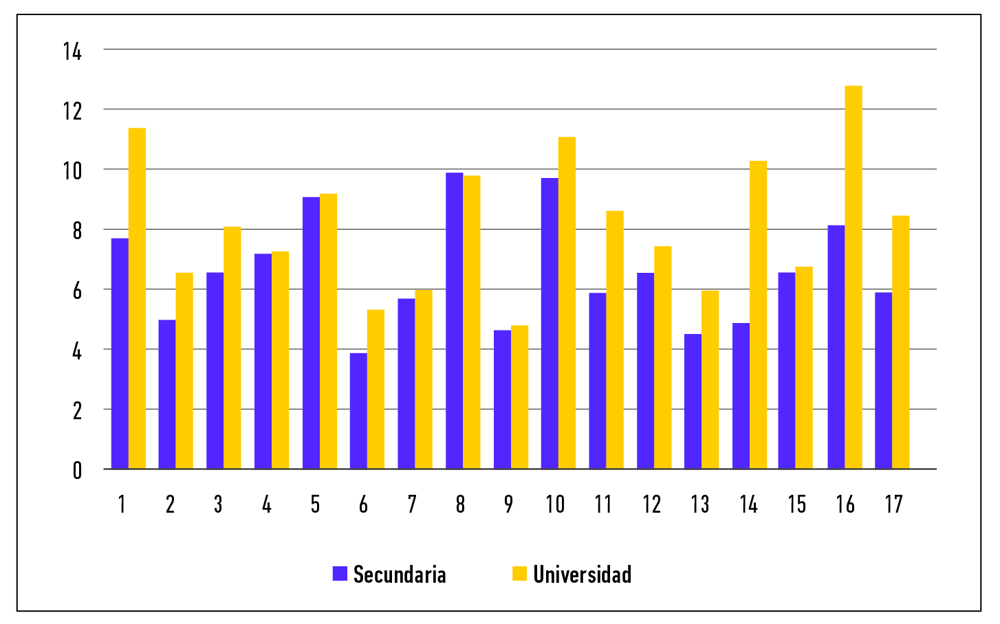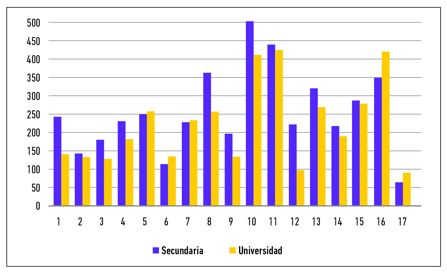 | Preuniversitarios (150) (Carcedo González, 2000) | Universitarios (50) (2000) | Secundaria (350) (Aabidi, 2020) | Universidad (350) (Serfati, 2016) | ||
