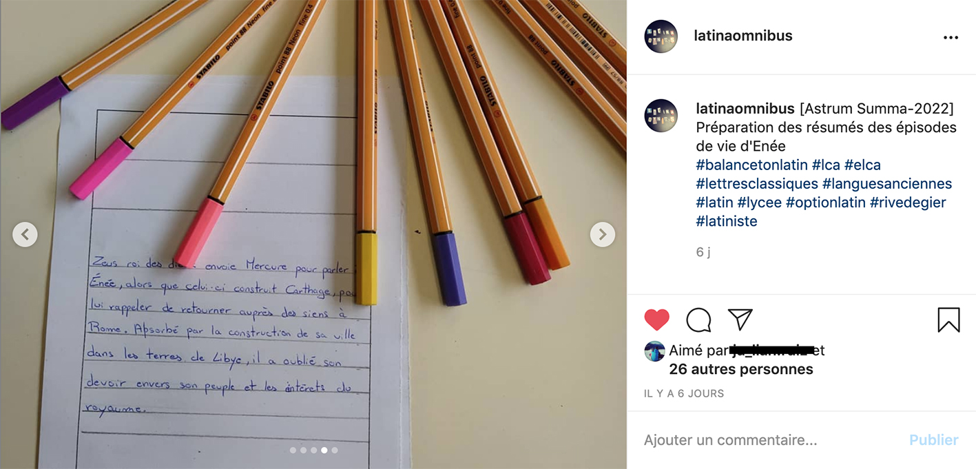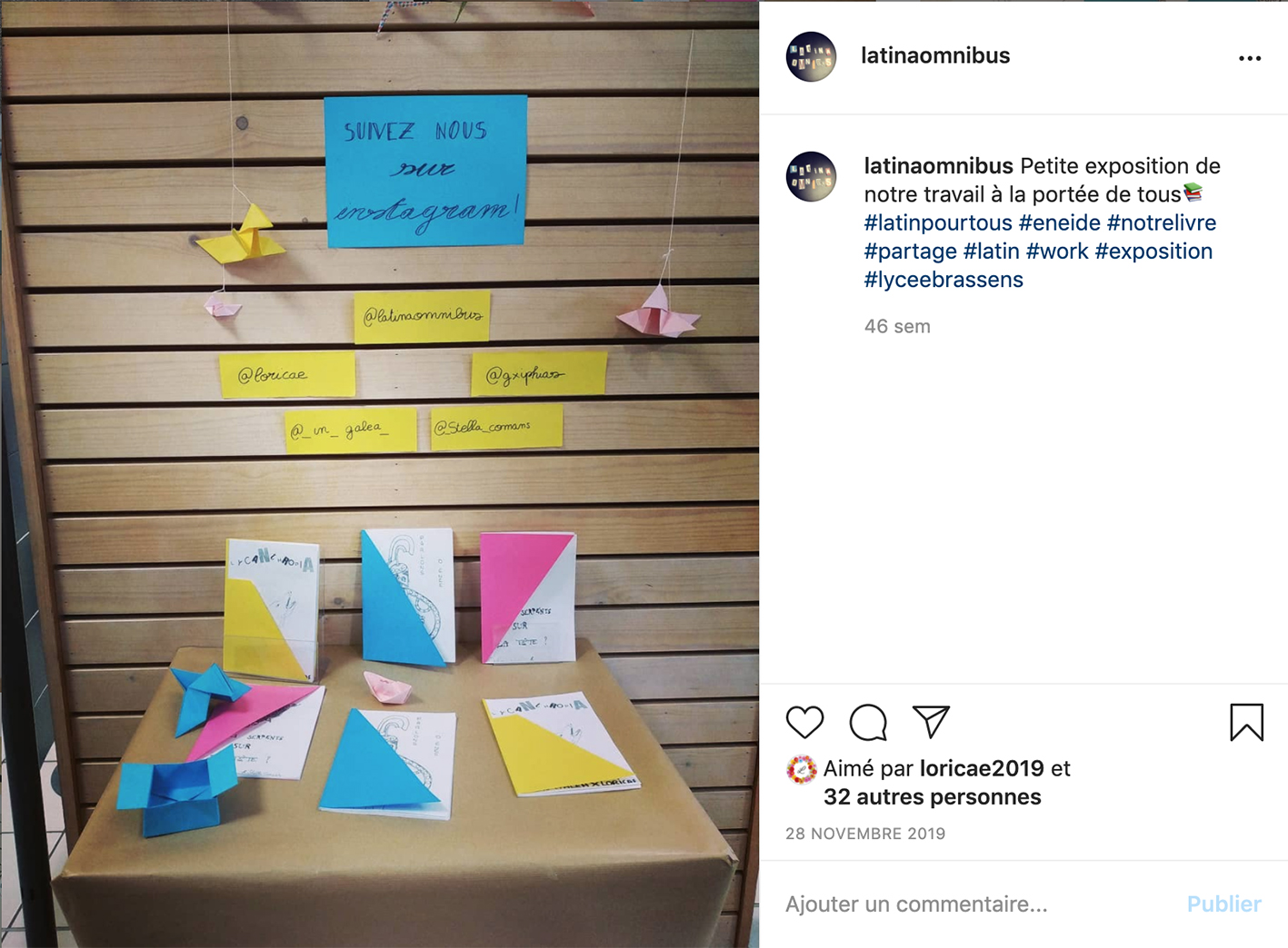 The dissemination of the project on the Instagram social network has a dual purpose. First, it is an opportunity for the students to keep a logbook and document their actions. Furthermore, it has the effect of widening the circle of learners through reaching a wider audience than only the high school and even promoting the teaching of Latin to future Latinists.