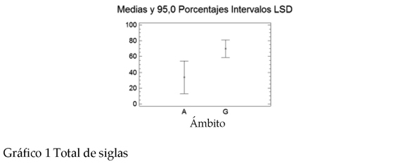 * Total de siglas. Tal y como se ha indicado antes en el análisis descriptivo, la diferencia total de siglas en GH y MA es significativa, es muy poco probable que sea fruto del azar.2 El ANOVA muestra que el número de siglas es superior en GH. El P-valor es 0.0322.