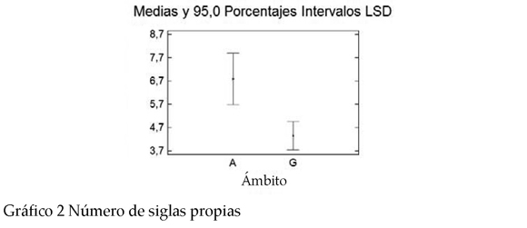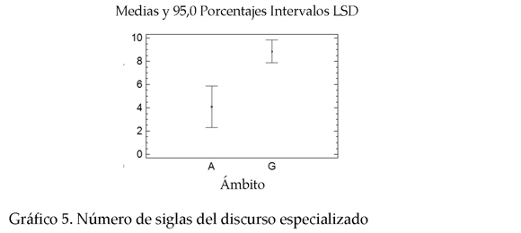 * Siglas generales y siglas especializadas. El análisis ANOVA muestra que las siglas generales (siglas que corresponden a nombres de instituciones y en general a todas aquellas unidades que no son términos) tienen mayor peso en MA. Sin embargo, en GH ocurre lo contrario, ya que son las siglas especializadas (aquellas que corresponden a términos) las que tienen la frecuencia más alta. El P-valor para las siglas generales es de 0.0000 y para las siglas especializadas 0.0012.