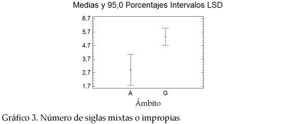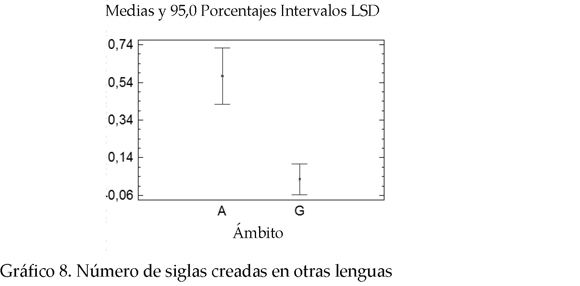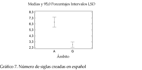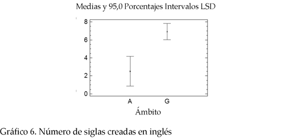 Este análisis se compone de dos partes. La primera parte corresponde al análisis de la varianza (ANOVA) de las poblaciones de GH y MA mediante el uso del programa estadístico Statgraphics1. Para la realización del ANOVA se tomaron los datos provenientes de la medición de un grupo de 23 variables, a saber: número de siglas, siglas diferentes, siglas con forma desarrollada, siglas sin forma desarrollada, siglas con 2, 3, 4, 5, 6 y más de seis caracteres, siglas propias, siglas mixtas, siglas generales (nombres de organizaciones), siglas especializadas, siglas creadas en inglés, siglas creadas en español, siglas creadas en otras lenguas, siglas en mayúsculas, siglas en minúsculas, siglas híbridas (may+min), siglas con caracteres alfanuméricos, siglas con variación traductiva y marca de plural.