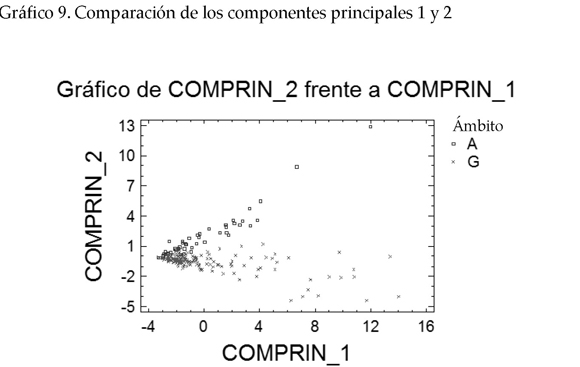 El gráfico generado representa al ámbito de MA con color negro y a GH con gris. Su interpretación revela que los valores negativos se han dado cuando el ACP ha recogido poco de todas las variables. Eso ha implicado que los valores tiendan a concentrarse y, por consiguiente, a que los dos ámbitos tiendan a parecerse. Por el contrario, los valores positivos indican que el ACP ha recogido mucho de todas las variables. Eso ha supuesto la dispersión de los valores y, por tanto, la tendencia de los dos ámbitos a diferenciarse. El gráfico en dos dimensiones de COMPRIN1 y COMPRIN2 se presenta a continuación.