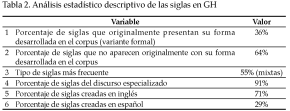 El corpus de GH está compuesto por 999.950 palabras, de las cuales 11.026 (1.10%) son siglas. Para este análisis se seleccionó el conjunto de variables que ofrecen un panorama general de las siglas dentro de este corpus en concreto. Las variables y sus valores correspondientes se detallan en la tabla que aparece a continuación.