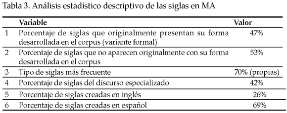 En lo que respecta al discurso especializado de MA, puede decirse que se caracteriza por presentar siglas cortas (2 caracteres) y extensas (6 o más caracteres), propias, generales y españolas.