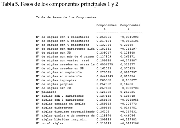 El componente principal 2 (COMPRIN2) muestra una alta correlación negativa con las siguientes variables: siglas con 3, 4 y 5 caracteres, con caracteres alfanuméricos, con variación por traducción, sin forma desarrollada, especializadas y número total de siglas, hecho que permite asociarlas al ámbito de MA.