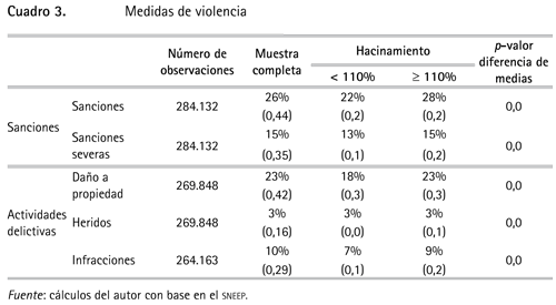 Las estadísticas descriptivas de las variables que miden la participación en actividades delictivas y la presencia de sanciones se encuentran resumidas en el cuadro 3, tanto para la muestra completa como para niveles de hacinamiento mayores y menores del 110%. En esta se puede observar que en todos los casos los porcentajes de sanciones y actividades delictivas son mayores cuando el nivel de ocupación supera el 110%, y esta diferencia es estadísticamente significativa.