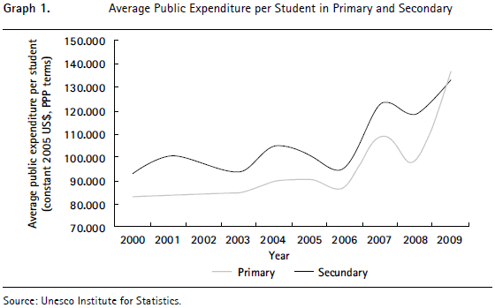 From a public spending perspective, if we express public educational expenditure per student as a percentage of GDP per capita for primary and secondary school, we can see the opposite situation than the one described before (see Table 2 and Graph 1). In this case, Latin America spends relatively more resources per student in secondary (11.1%) than in primary (10.4%). This is because secondary level has fewer students and the inputs (teachers, technology, infrastructure, etc.) are more specialized and expensive than those in primary.