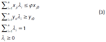 [0,1] are the intensities (weights) on copying the other countries behaviors and all together must be less or equal than the input available for country D (xD). On the other hand, the output constraints show that the weighted sum of the outputs must be grater or equal than the potential output. In this case, the allocation of the input would produce λ1y1,A + λ2y1,B + λ3y1,C + λ4y1,D of output 1 and λ1y2,A + λ2y2,B + λ3y2,C + λ4y2,D of output 2, which can be expanded at the factor ε. Finally, we impose the restriction λ1 + λ2 + λ3 + λ4 = 1 in order to allow convexity of the frontier, accounting for variable returns to scale.31 Variable returns-to-scale technology envelops the data tightly to determine the efficiency frontier. According to Fried, Lovell and Schmidt (1993) this assumption also makes that convexity on the production possibilities set be imposed by requiring strictly positive input to produce nonzero outputs. This assumption is appropriate when DMU are not operating at optimal scale because of imperfect competition, governmental regulations, constraints on finance, etc.