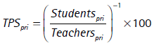 It is commonly accepted that public expenditure is the most important input to expand the educational outputs. Nevertheless, input variables may include not only public expenditure per student, but also physical indicators such as teachers per student ratio, number of instruction hours, and availability of computer, among others. Of course these physical indicators are the result of public expenditure in the sector. In this order of ideas, we suggest a complementary analysis using teachers per student ratio (as a non-monetary input) instead of public expenditure in education.