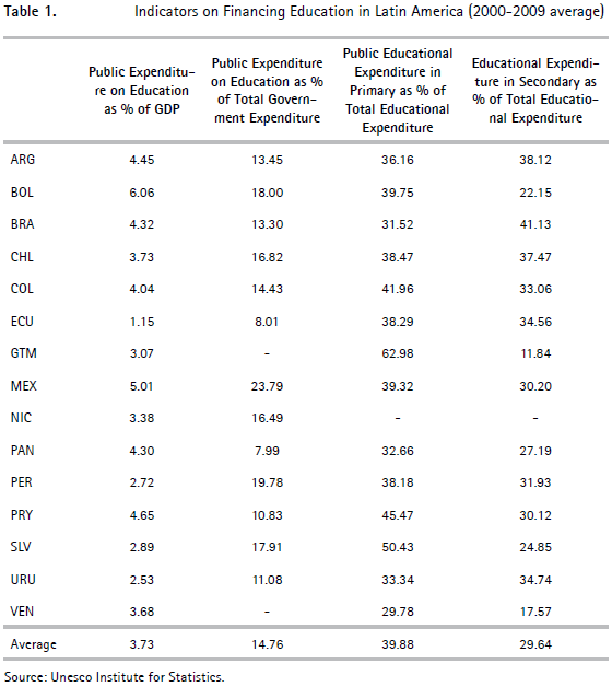 Table 1 shows that during the last decade, on average, Latin American countries finance their education with 3.7% of its GDP, which represents 14.8% of the total government expenditure. From this resource, the government allocates 39.9% in primary school and 29.6% in secondary school. Nevertheless, there are big differences on how each country finance it educational system; for example Bolivia spend 6.1% of its GDP for education, while Ecuador just spend 1.15%. If we compare this effort as percentage of the government expenditure, we find that Mexico spend 23.8% and Panama and Ecuador just 8%.
