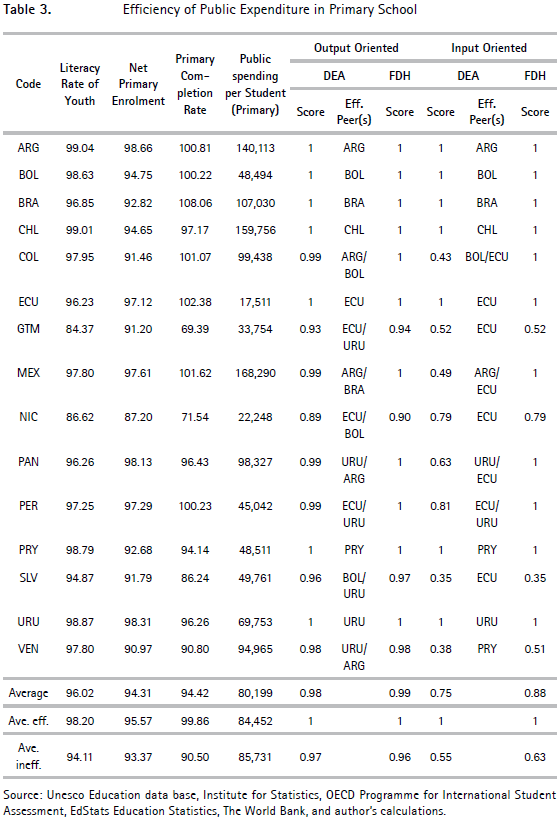 - Efficiency of public expenditure in primary level. This is a single-input three-outputs analysis where public education spending per student in primary school (xi