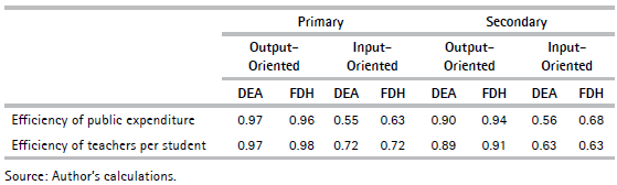 As it was described before, this section presents the relative technical efficiency of public expenditure on education in the Latin American countries. As a complementary analysis, the relative technical efficiency of the available teaching staff is also presented and compared with the first one. These exercises are presented for primary and secondary education, separately. Although input and output-oriented efficiency scores are calculated and presented in the tables, the interpretations will be focused on the output-oriented results because the main core of the public sector is to determine the percentage of public services that can be increased without decreasing the inputs used. Even more, from a budgetary policy point of view the government should not try to reduce the public expenditure to achieve the same amount of output (input-oriented analysis). But it should evaluate how much more output could produce at the same level of public expenditure (output-oriented). The inputoriented scores are used just as a reference to determine the wasted resources to achieve the current educational outputs.