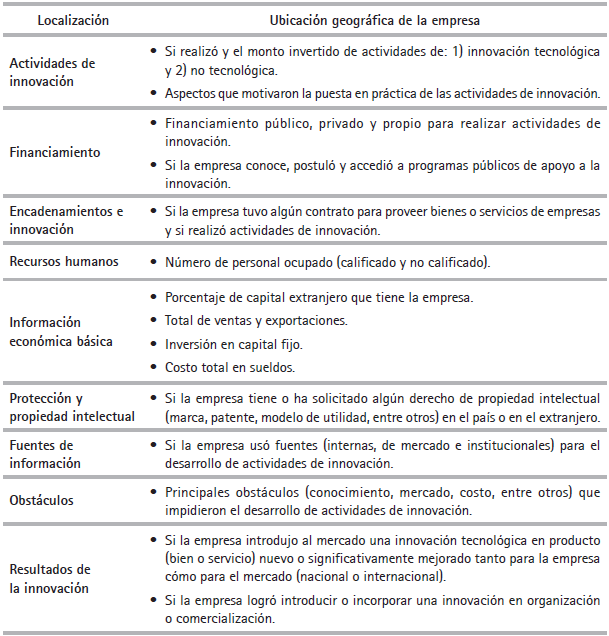 Una limitación de la ENIIM 2015 es que no puede ser unida a la ENIIM 2012 (que contiene información para el periodo 2009-2011) para poder disponer de un panel de datos, ya que existe menos del 20 % de empresas manufactureras comunes en ambas encuestas. Unir ambas encuestas genera resultados sesgados debido a que sería una muestra poco representativa a nivel nacional. Una descripción más detallada de lo que contiene la ENIIM 2015, tanto a nivel de insumo como de producto, es presentada en la Tabla 1.