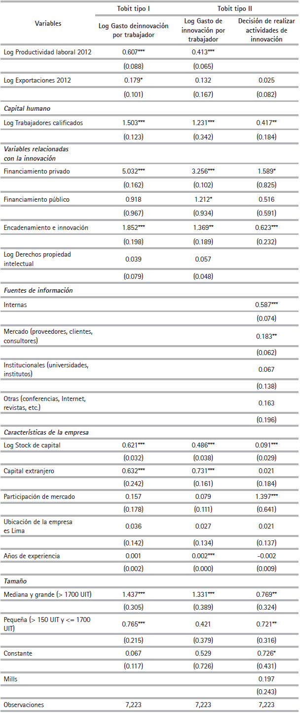 Respecto a las estimaciones usando un modelo Tobit tipo I se encuentran resultados interesantes. En primer lugar, los resultados muestran que la productividad y las exportaciones incrementan el gasto en I+D (aunque no afectan la decisión de realizar actividades de innovación). Así, se encuentra el cumplimiento de innovating by exporting para el caso peruano. Otras de las variables fundamentales, y no menos importantes que las anteriormente mencionadas, son el acceso a fuentes de financiamiento privadas y a trabajadores calificados, las cuales garantizan mayor intensidad en el gasto de I+D.