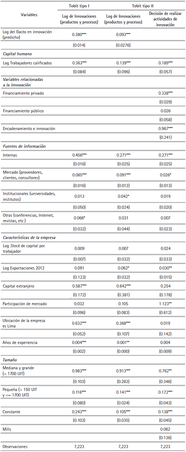 Donde δ0 es un término constante, γ0 y α3 son coeficientes a ser estimados, ui1 es el componente de error y d es el umbral donde Ii es observado. Es importante mencionar que Wi0 es un vector de variables independientes que representan: 1) el logaritmo de trabajadores calificados, 2) el porcentaje de financiamiento público y privado que tuvo la empresa para la realización de actividades de innovación, 3) variable dicotómica si la empresa tuvo algún contrato para proveer de bienes o servicios a empresas del sector minero, forestal, acuícola o pesquero, que permitió realizar actividades de innovación (encadenamiento e innovación), 4) variables dicotómicas relacionadas con diferentes fuentes de información (internas, mercado, institucionales, otras), 5) logaritmo del capital por trabajador, 6) porcentaje del capital extranjero en su capital total, 7) la participación de las ventas de la empresa respecto al total del mercado, 8) variable dicotómica si la empresa se ubica en Lima, 9) años de experiencia de la empresa y 10) el tamaño de la empresa (variables dicotómicas para las micro, pequeñas y medianas/grandes empresas).