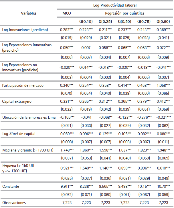 Un aspecto a resaltar es que no necesariamente las mayores innovaciones realizadas por las empresas se encuentran en aquellas que tienen una productividad mayor. Por ejemplo, tal como se puede observar en la Tabla 6, aquellas empresas que se encuentran en el quintil 0.25 innovan menos que las ubicadas en el quintil 0.10. Esta última evidencia si bien es similar a lo obtenido por Cintio et al. (2017), se explica por la medición de productividad (ventas entre el número de trabajadores) que al estar relacionado con algunas regresoras (endogeneidad) puede sesgar la magnitud de algunos coeficientes.