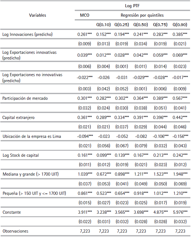 A continuación se muestra el impacto entre la innovación y las exportaciones sobre la productividad laboral y la PTF considerando las estimaciones anteriores. Dado que los efectos de la innovación pueden variar a través de la distribución condicional de la productividad, vale la pena calcular estas estimaciones por quintiles, un método que es generalmente más eficiente que el de 2SLS (Bravo-Ortega et al., 2014; Cintio et al., 2017).