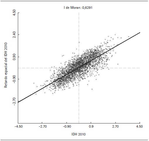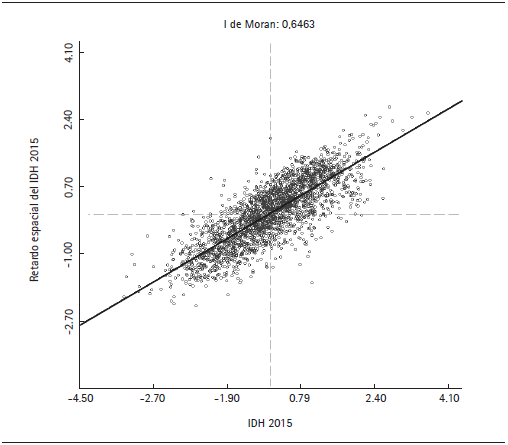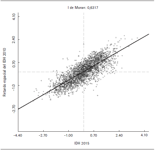 El valor esperado de la I de Moran varía entre +1 y -1. Un valor positivo indica que la distribución del IDH presenta autocorrelación espacial positiva, lo cual es una señal de que los municipios contiguos con características semejantes tienden a agruparse geográficamente; por el contrario, un valor negativo denota autocorrelación negativa, sugiriendo una propensión a la oposición; mientras que un valor cercano a cero es evidencia de una distribución aleatoria de la variable analizada. El estadístico de la I de Moran global se puede visualizar en el diagrama de dispersión de Moran univariado, ya que representa la pendiente de la recta de regresión de la variable x i,t (eje de abscisas) y el rezago espacial Wx t (eje de ordenadas), este último se define como el promedio ponderado de la variable analizada de los vecinos del municipio i (Anselin, 1996).
