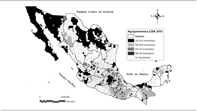 La notación de la I de Moran local es similar a la descrita en la ecuación (1). Los resultados se visualizan en el mapa de agrupamientos LISA univariado, el cual permite identificar cuatro tipos de clústeres o agrupamientos espaciales estadísticamente significativos, agrupamientos con IDH similares, alto-alto (AA) y bajo-bajo (BB), que contiene a los municipios con valores altos o bajos de la variable rodeados por aquellos con valores altos o bajos; en cambio, los agrupamientos con IDH disímiles entre un municipio y sus vecinos, alto-bajo (AB) y bajo-alto (BA), comprende a los municipios con valores altos rodeados por vecinos de valores bajos y viceversa. De esta manera, cuando el LISA toma un valor positivo (autocorrelación espacial positiva) indica un agrupamiento AA y BB, mientras que un valor negativo (autocorrelación espacial negativa) denota un agrupamiento AB y BA.