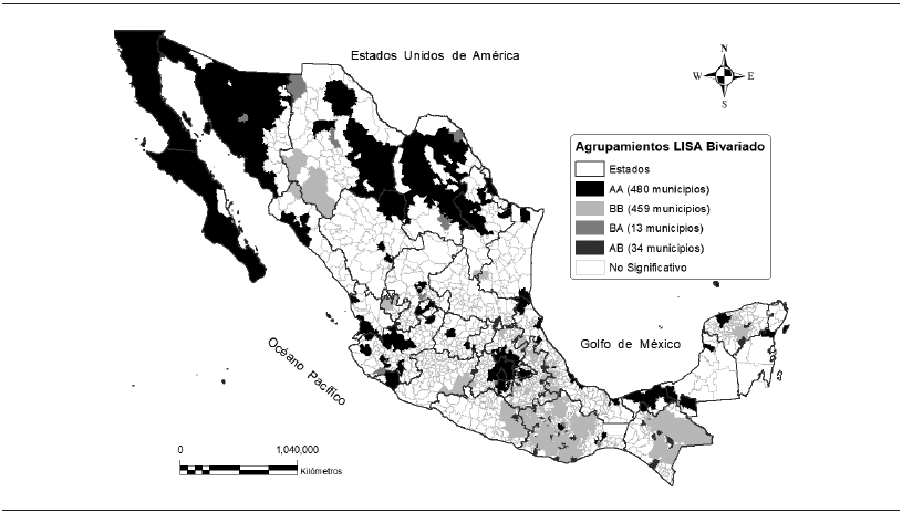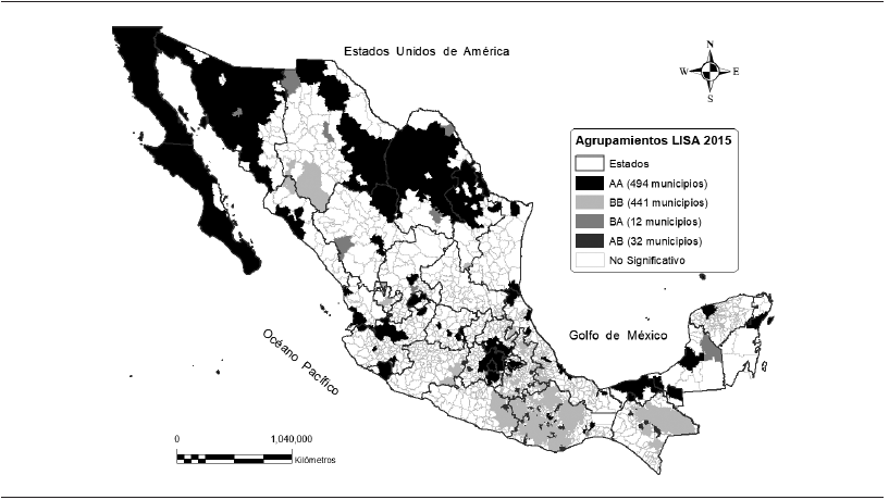 Con la ayuda de los estadísticos LISA univariado se mostró que la dependencia espacial positiva sobresale entre los municipios para 2010 y 2015, esto ha conducido a que coexistan y predominen las dinámicas espaciales virtuosas (AA) y viciosas (BB) de desarrollo humano al interior del territorio mexicano. Los municipios con estas dinámicas no están dispersos en el espacio, sino que se concentran en ciertas áreas geográficas específicas, los virtuosos de alto desarrollo se localizan en las entidades federativas que tienen frontera con Estados Unidos de América y en las zonas metropolitanas, principalmente en la megalópolis de México; mientras que los municipios viciosos de bajo desarrollo se concentran en el sur y sureste del país, específicamente en los estados con mayor rezago, Chiapas, Oaxaca y Guerrero.