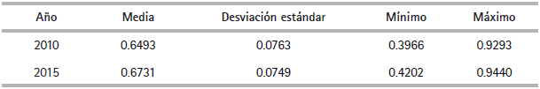 Tabla 2. Estadística descriptiva del IDH municipal, 2010 y 2015