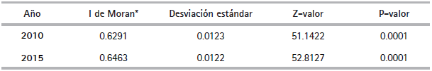 En la Tabla 2 se muestran los estadísticos de la I de Moran global univariado, los cuales indican la existencia de una fuerte autocorrelación espacial positiva con un ligero aumento en 2015, a un nivel de significancia del 99 % (p-valor = 0.0001) sobre la base de 9999 permutaciones, utilizando una matriz de contigüidad tipo queen de primer orden3.