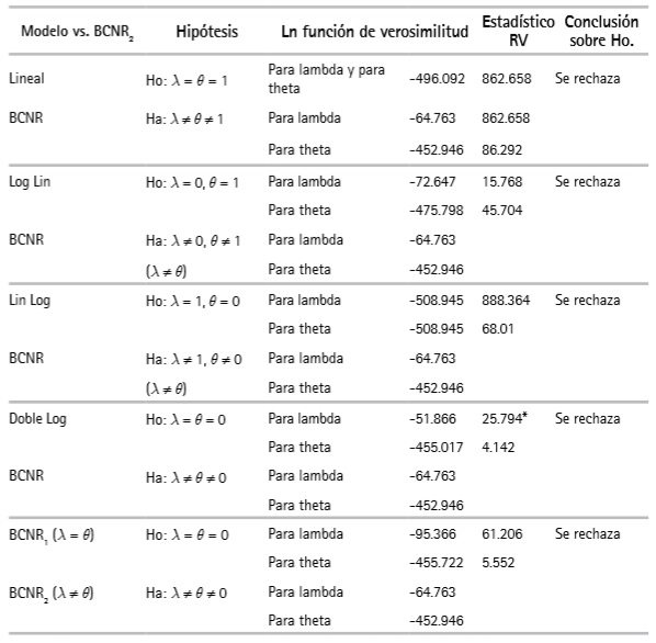 Al realizar las pruebas de bondad de ajuste en los diferentes modelos, con la razón de verosimilitud RV, se encontró que la forma funcional BCNR2 con un valor de