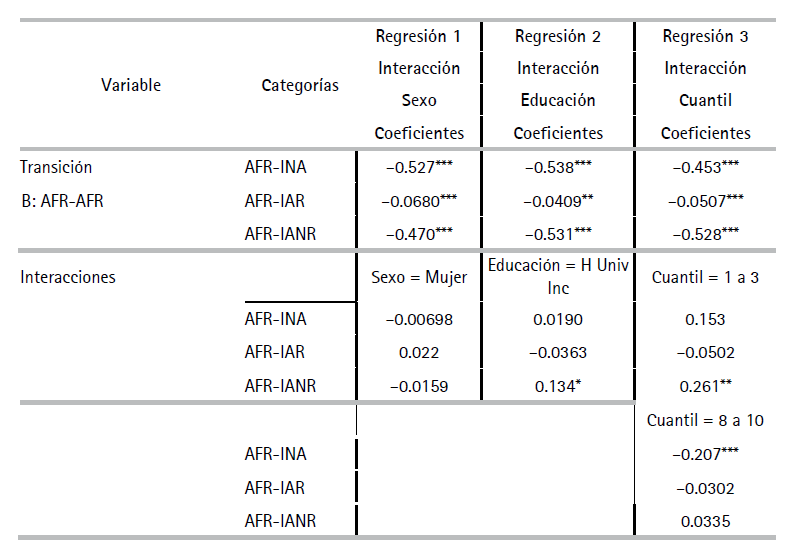 Los resultados anteriores corresponden a las diferencias encontradas para el conjunto de los trabajadores analizados. Sin embargo, las transiciones pueden afectar de diferente manera a distintos grupos de los inicialmente ocupados como AFR. Para ello, se estimó el mismo modelo con interacciones entre la variable correspondiente a las transiciones, y otras que aparecen como relevantes. Específicamente, se exploran tres de estas variables: sexo, educación y el decil de origen de los individuos (cuadro 8).