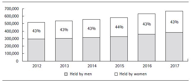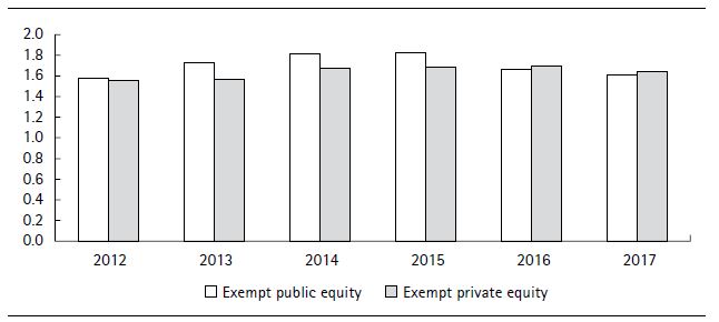 The significant difference in wealth attributed to equity holdings leads to several noteworthy conclusions. On the one hand, private equity is the largest asset class in the wealth structure, amounting to 33 percent of total wealth. And secondly, both categories have deep social and economic implication since they depict the ownership of the means of production. This substantial difference in the pattern of wealth accumulation shows that the gap between men and women’s wealth increases to 60 percent when considering only the property of the means of production. Therefore, we observe a property structurewhere men control the largest share of entrepreneurial wealth and theincome derived from these enterprises. A large part of these asset classes isexempt from property tax, which indicates that the design of this tax favorsmen. We revisit this issue in Section 5.5. Between 2012 and 2017, men’s holdings of wealth in the form of exempt privateequity was around 1.7 times greater than that of women. We observe asimilar pattern in the case of exempt public equity (Figure 3).
