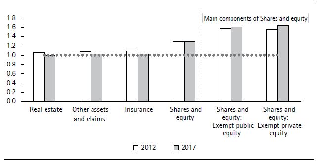 Figure 2. Asset breakdown of wealth componentsNote: Shares and equity contains listed shares in collective investment institutions, non-exempt public and private equity, and exempt public and private equity.