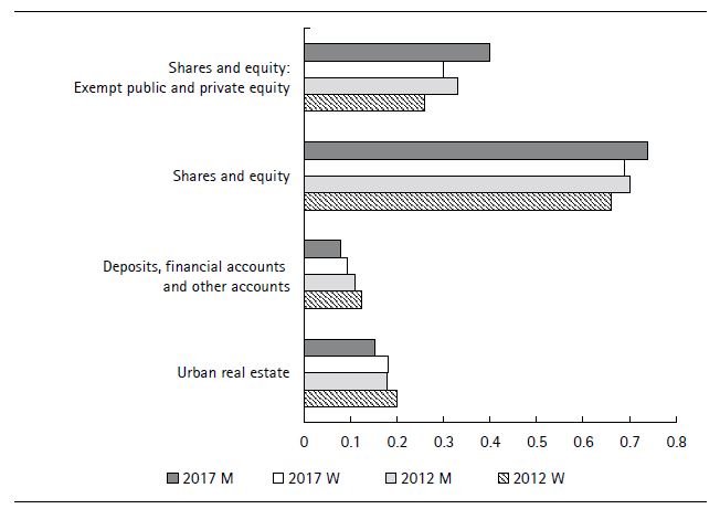 Within this category, the greatest differences are observed in holdings of exempt public and private equity, which are also among the main components of the category (44 percent for women and 54 percent for men).