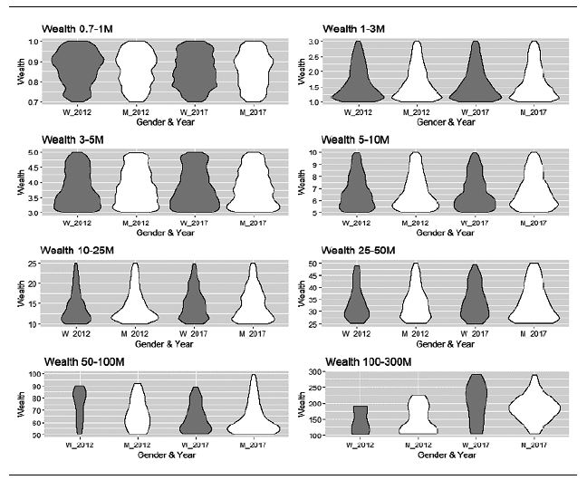 To conduct a more in-depth analysis of wealth distribution by gender, we depict density functions that represent different segments of wealth. Figure 5 illustrates different segments for each gender, allowing us to identify possible pattern changes between 2012 and 2017 and confirm the previously mentioned stylized facts. We observe a general increase in density for both genders above the segment ranging from 25 to 50 million euro. However, men consistently start from a higher wealth level compared to women in both in 2012 and 2017. In the lower wealth segments, there are no substantial changes throughout the period. Notably, there is a higher proportion of women in the first cut (from 0.7 to 1 million euro) in both years.