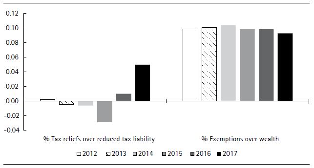 Figure 6 illustrates the percentage of tax reliefs on the total tax liability reduced by the deductions (“reduced tax liability”) and the relevance of the exemptions on total wealth from 2012 to 2017. The figure shows the difference between these magnitudes for men and women.