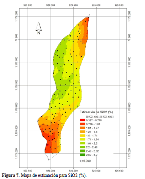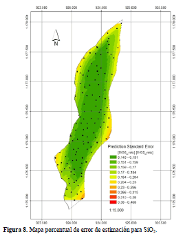 La Figura 7 representa el mapa de estimación para el SiO2 donde se observa un incremento en el contenido, en aquellas zonas donde disminuye el porcentaje de CaO, denotando su relación negativa. Al igual que los porcentajes de estimación de error para MgO, el error del SiO2 tiene un comportamiento muy homogéneo, encontrándose los valores más altos en los límites del cuerpo calcáreo (Figura 8).
